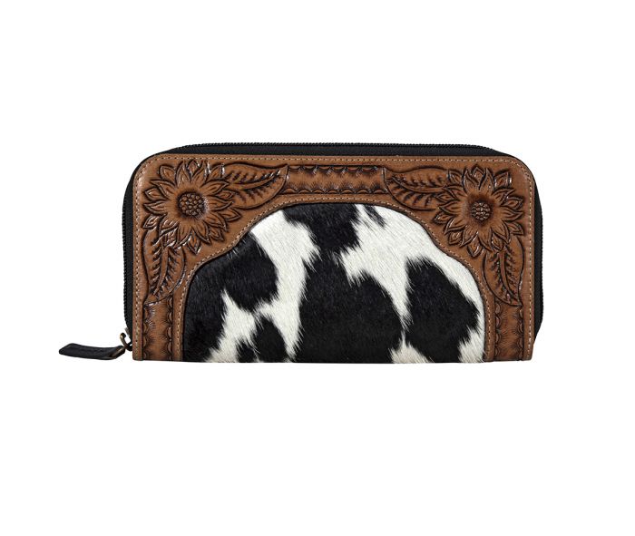 This splendid wallet features a classic design, merging gorgeous hair-on hide and hand-tooled leather. The interior offers plenty of sections to keep things organized, including a zippered pocket. A zipper-close top will keep everything inside secure. Stylish and superbly eye-catching!